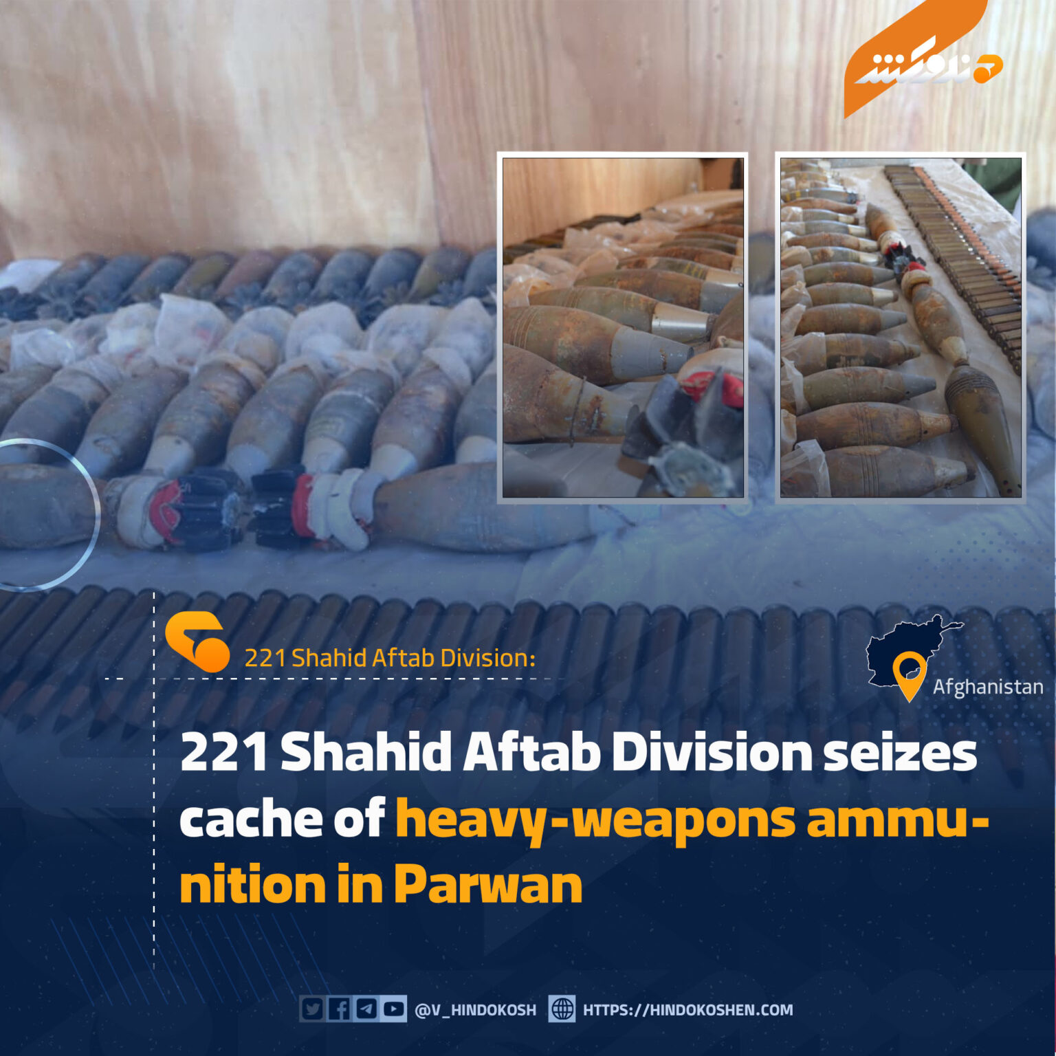 The 2102 Brigade of the 221 Shahid Aftab Division in Parwan province has seized a cache of heavy-weapons ammunition in Khak Ali, Sheikh al-Ali district.