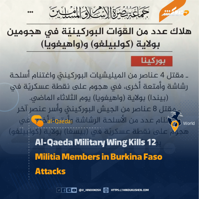 The al-Qaeda-linked military wing, Jama’at Nusrat al-Islam wal-Muslimin, carried out three attacks on army forces and militias in Burkina Faso, killing 12.