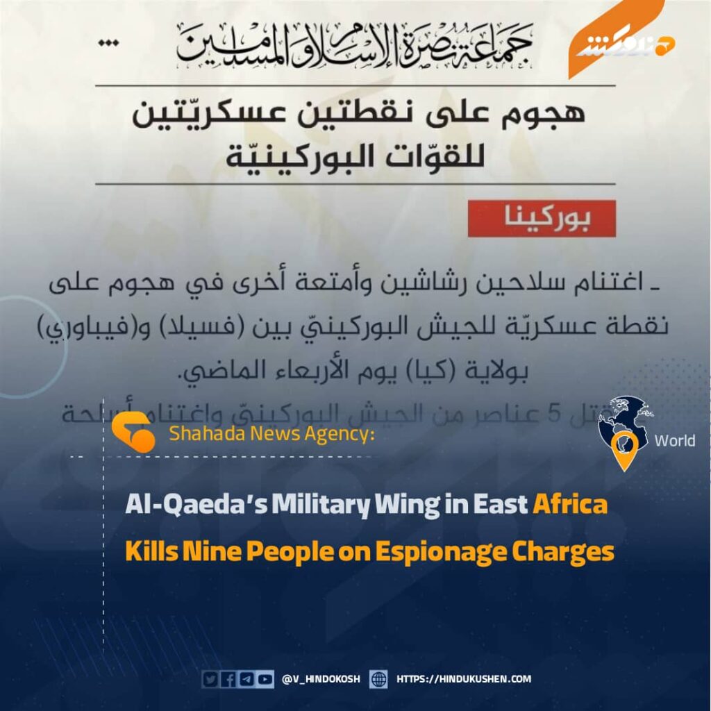 The Shahada News Agency reported that Al-Qaeda’s military wing in East Africa, the Harakat-Al-Shabaab Almujahideen, killed nine people in Somalia’s Bay region on charges of spying for the United States and Somalia.