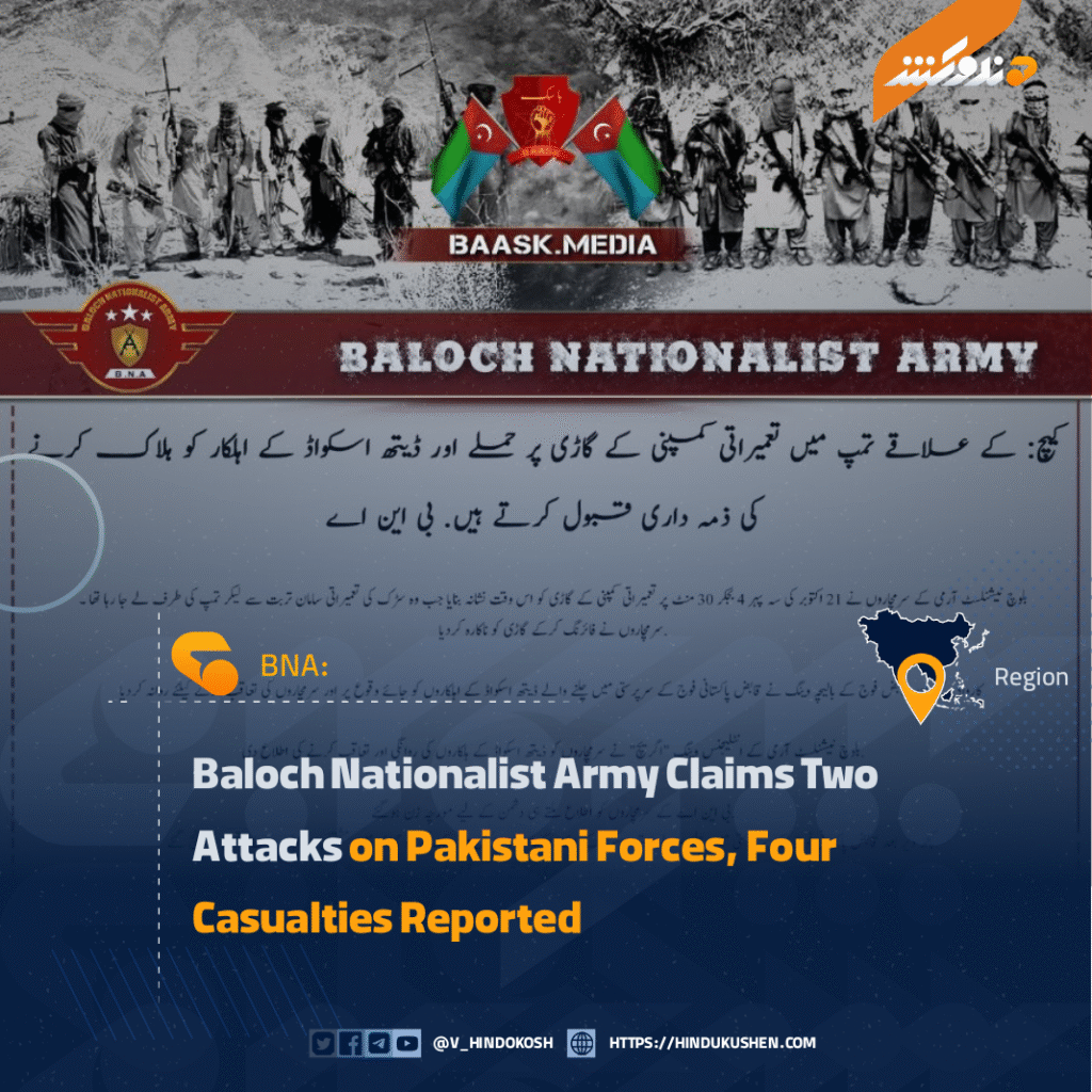 In a statement, the Baloch Nationalist Army (BNA) claimed responsibility for two separate attacks that left two Pakistani soldiers dead and two others injured.