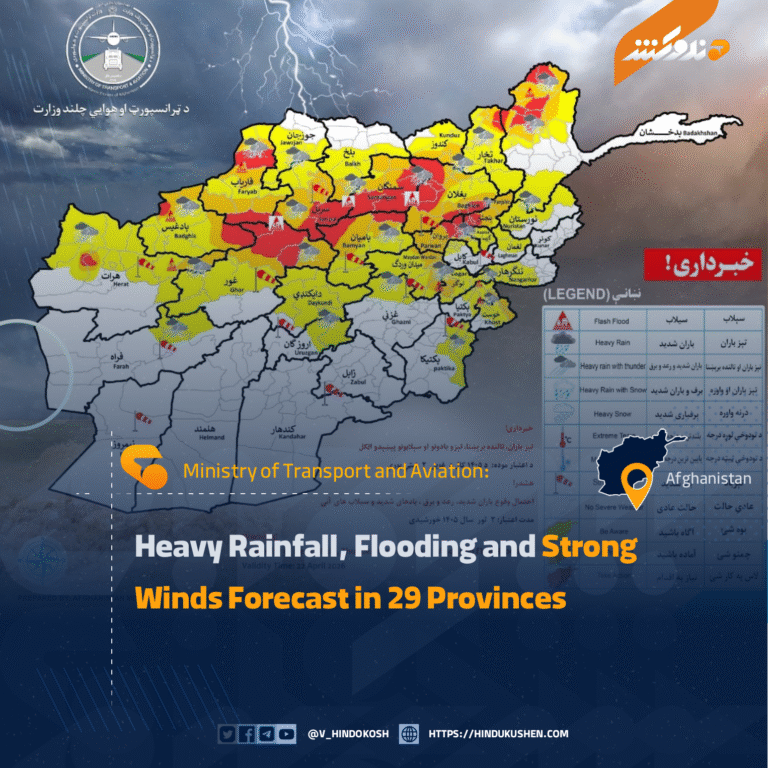 The directorate also warned of strong winds, including in Salang, as well as in southern, central, and southeastern provinces, with wind speeds forecast to reach between 50 and 100 kilometers per hour.