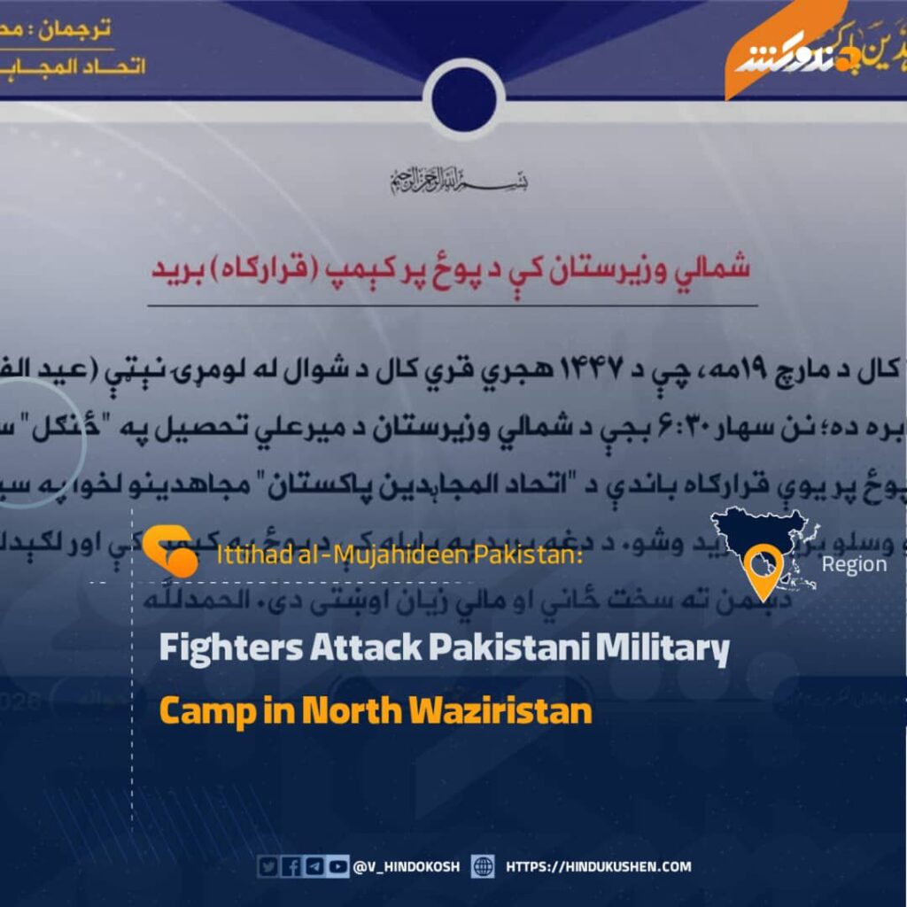 The Ittihad al-Mujahideen Pakistan organization has stated that its armed fighters carried out an attack this morning on a Pakistani military camp in the Mir Ali area of North Waziristan.