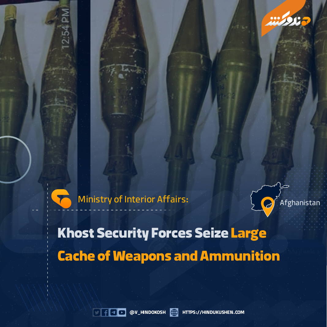 The Ministry of Interior Affairs announced that Khost Provincial Police have seized a substantial cache of weapons and ammunition in Danyoo Jaba village, Zazai Maidan district.