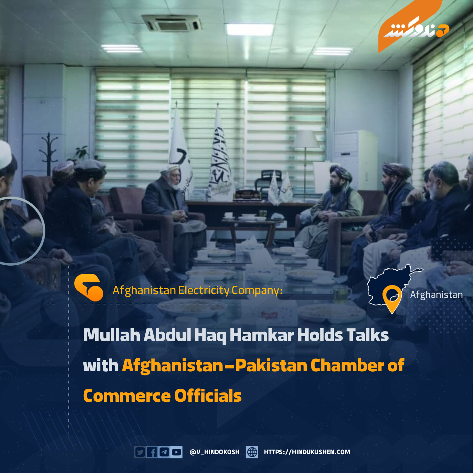 Mullah Abdul Haq Hamkar, head of the Afghanistan Electricity Company (Da Afghanistan Barqana Shirkah), met with officials from the Afghanistan–Pakistan Joint Chamber of Commerce to discuss the expansion of electricity infrastructure, investment opportunities, and potential public-private sector collaborations.