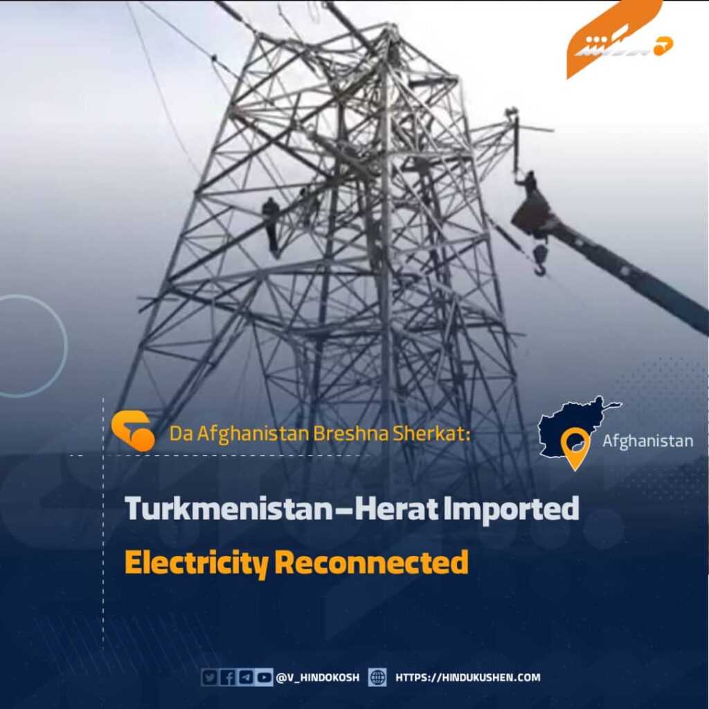 According to the DABS, with the reconnection of these lines, electricity to Herat city and the districts of the province, which is supplied through imported power from Turkmenistan, has been restored.